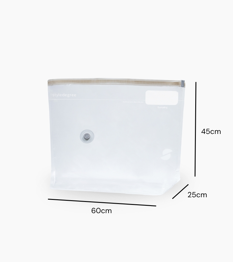 Meet the Dumpling ClearVacuum™ Bag — cute by name, mighty by design. Its wide base gives extra depth, making it perfect for neatly stacking clothes at home or slotting effortlessly into your luggage. Doubly-thick, durable, and certified non-toxic, it keeps your essentials snug and your space happily decluttered.