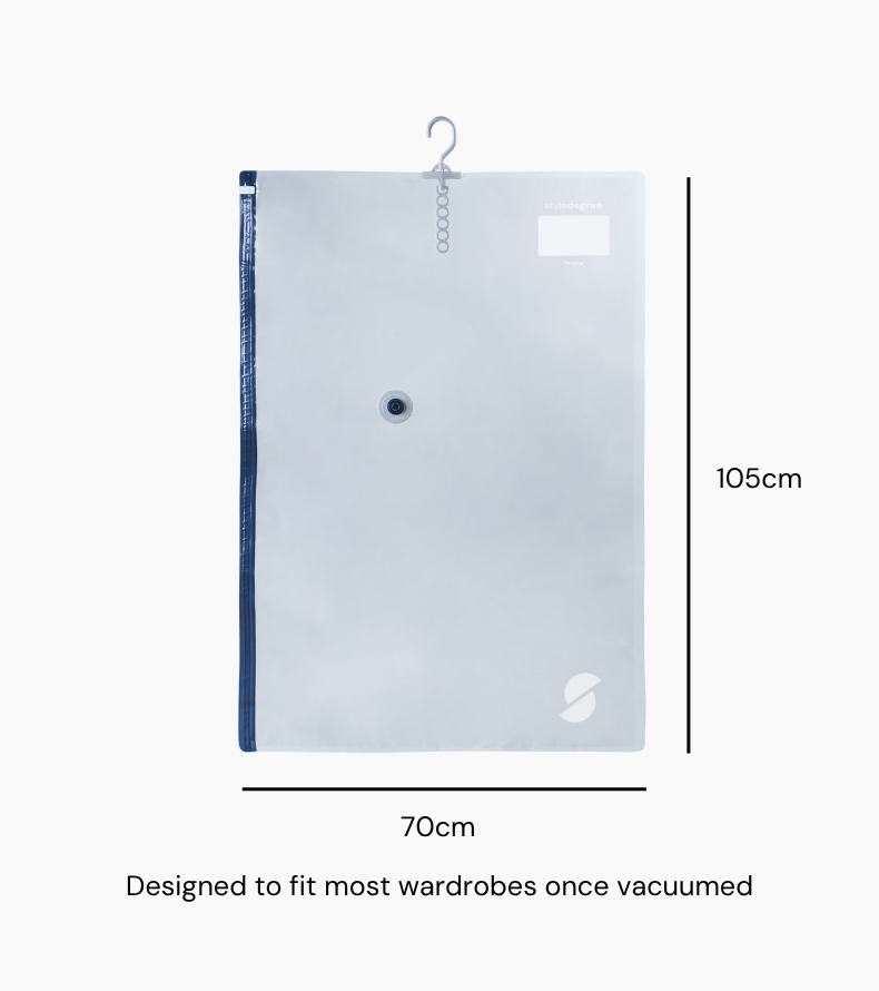 The Hanging ClearVacuum™ Bag is specially created to double your wardrobe space. From blazers and special occasion dress to winter jackets, it is designed to fit up to 5 pieces of clothing. The bag keeps your favourites compressed, protected, and neatly hung — no creases, no dust, just ready-to-wear ease. Made to last with doubly-thick, durable, and certified non-toxic material.
